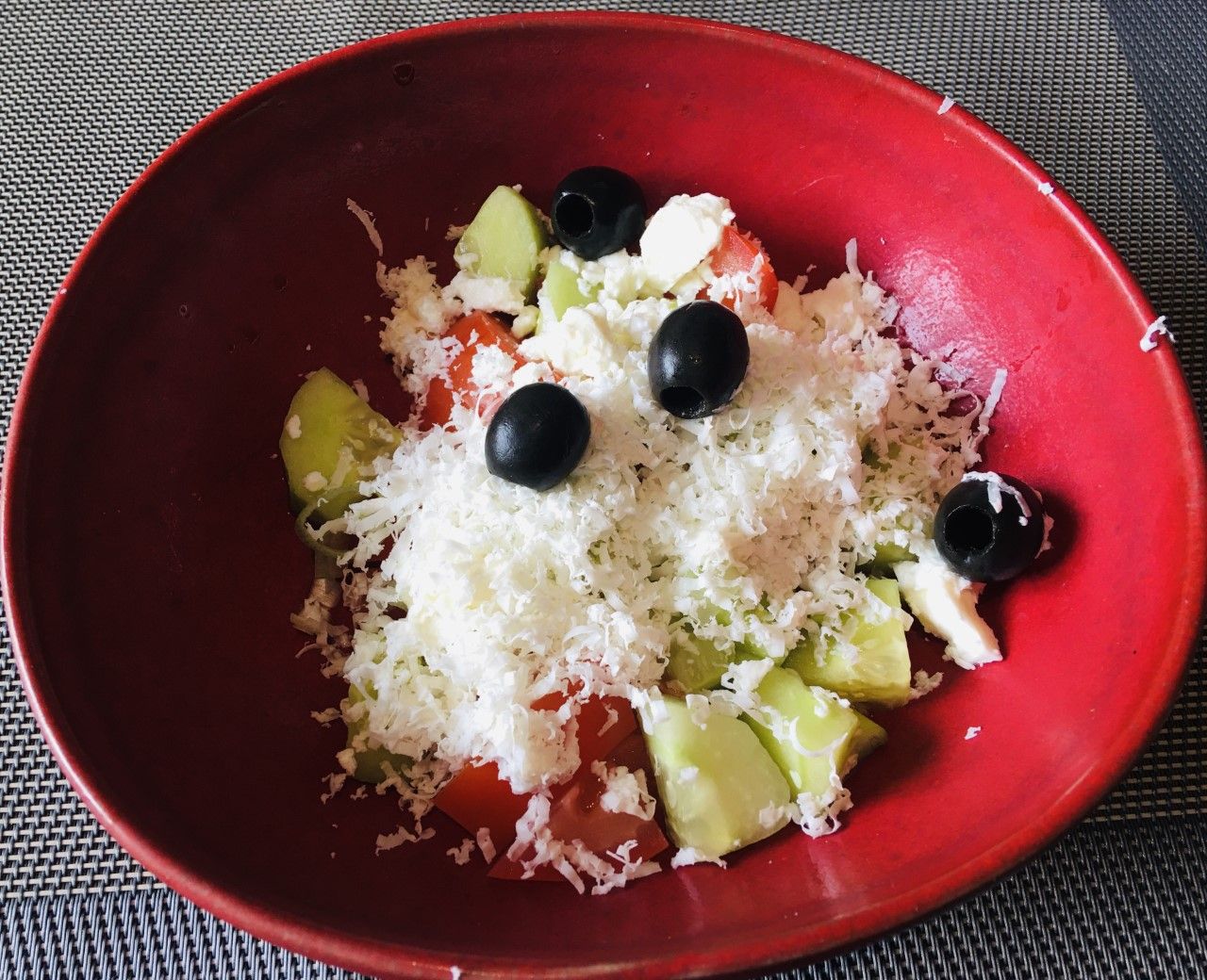 Un clin d’œil aux origines bulgares de Sandra. On retrouve dans cette entrée emblématique de son pays les couleurs du drapeau : blanc, vert, rouge, avec le fromage râpé, le concombre et la tomate.